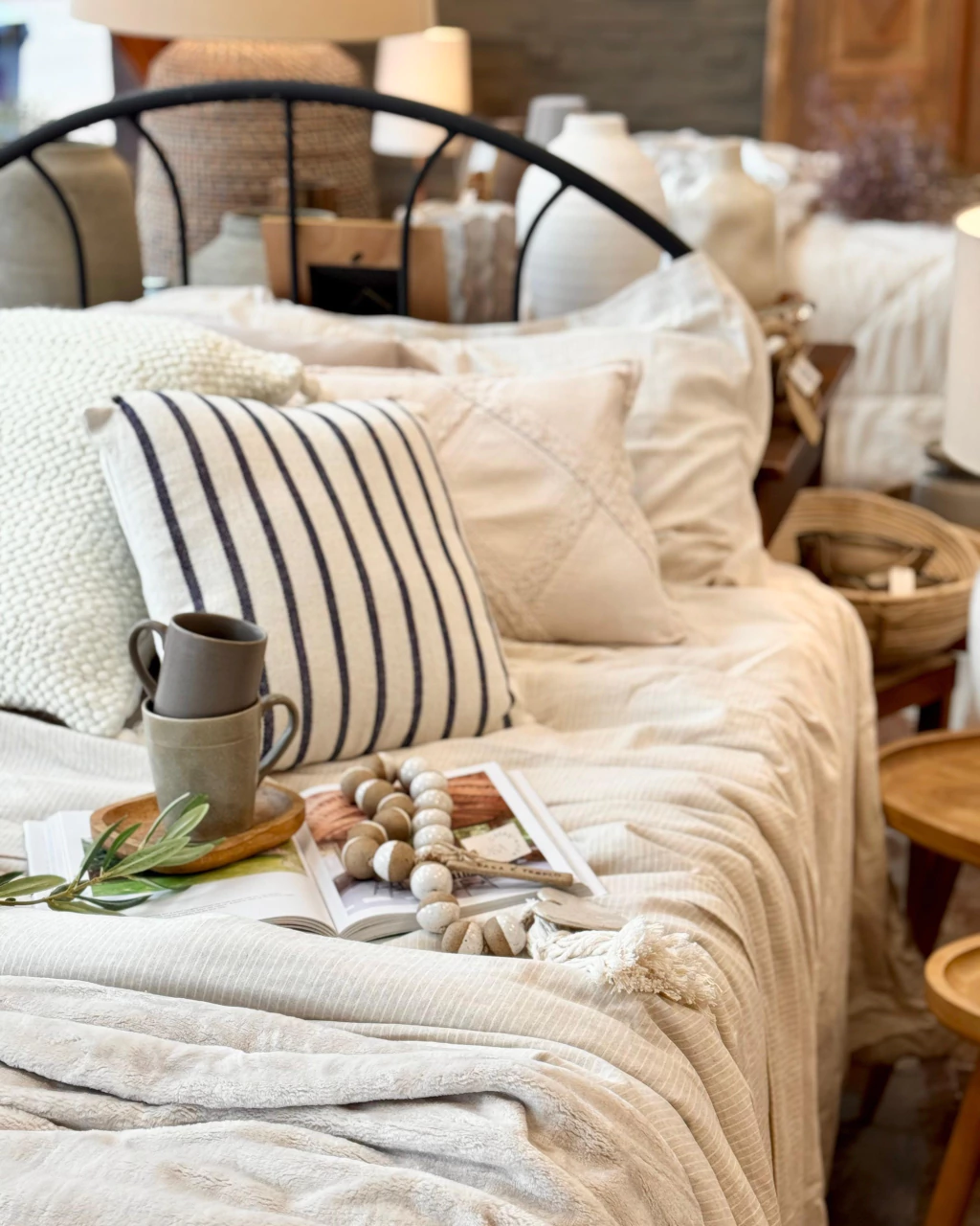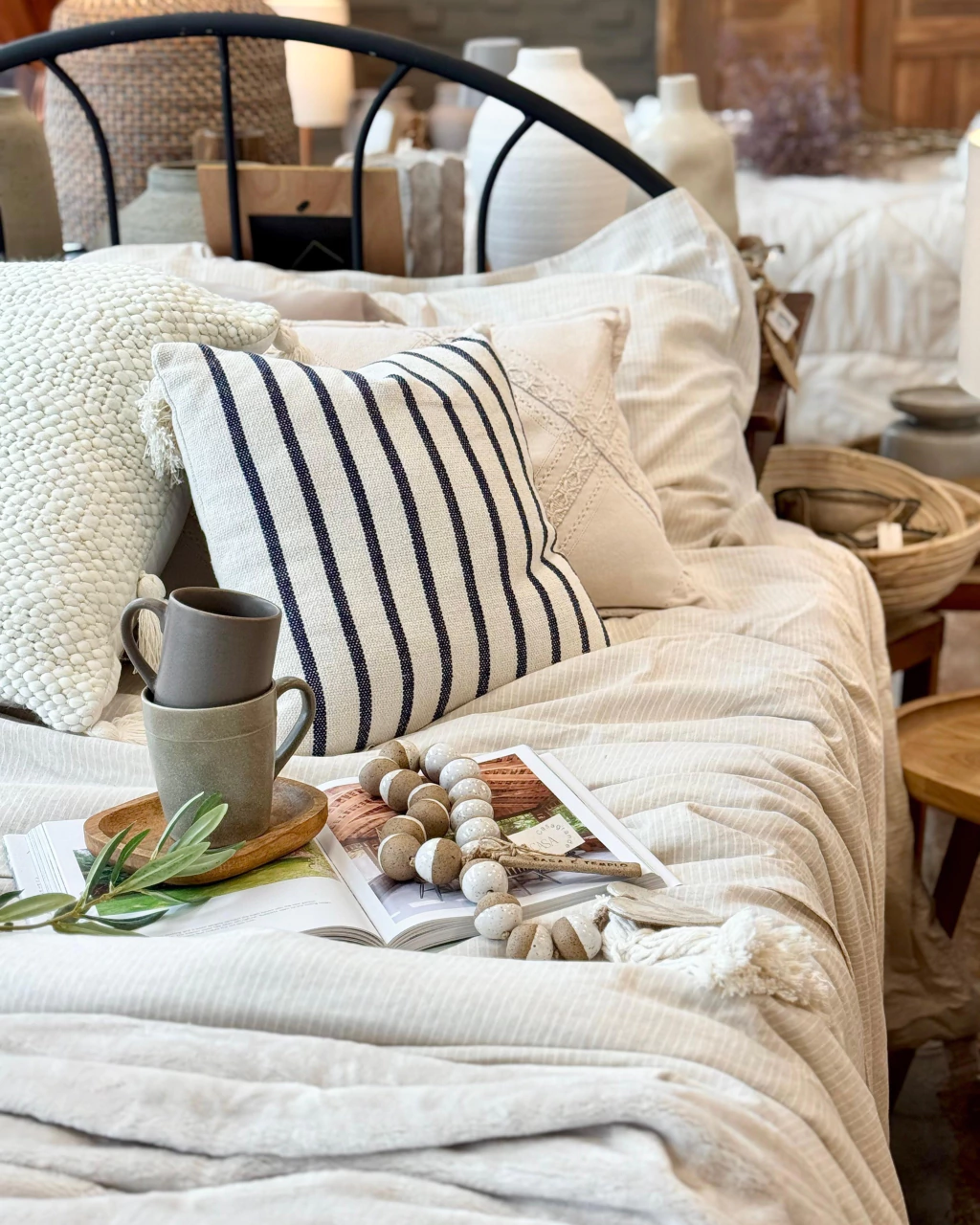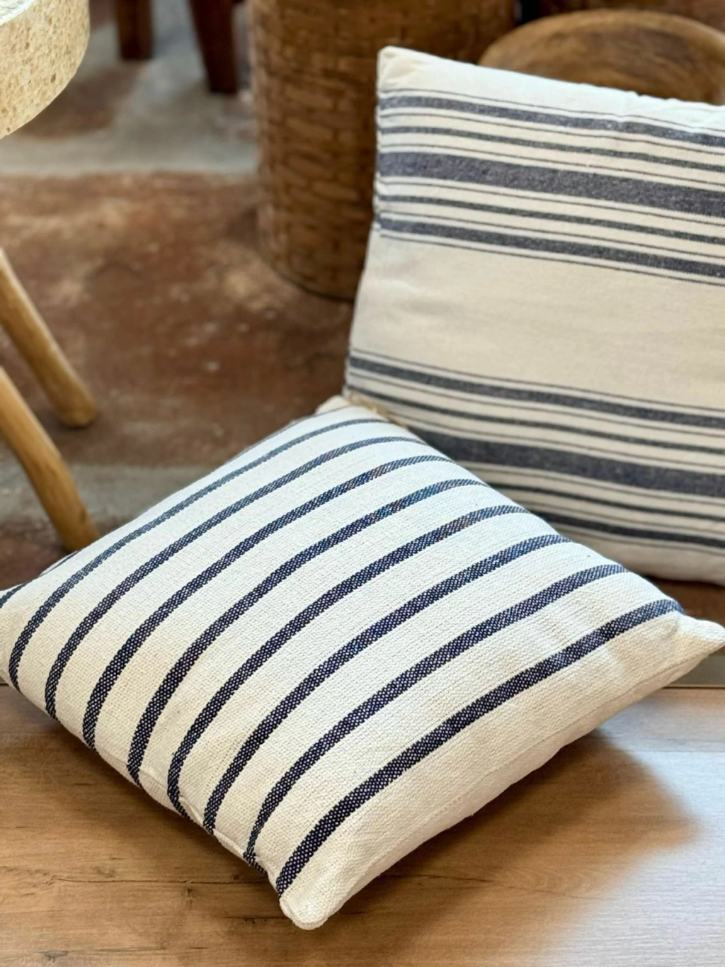 Toda feita em tecido natural cru, com listras em tom de azul. Para compor lindezas!