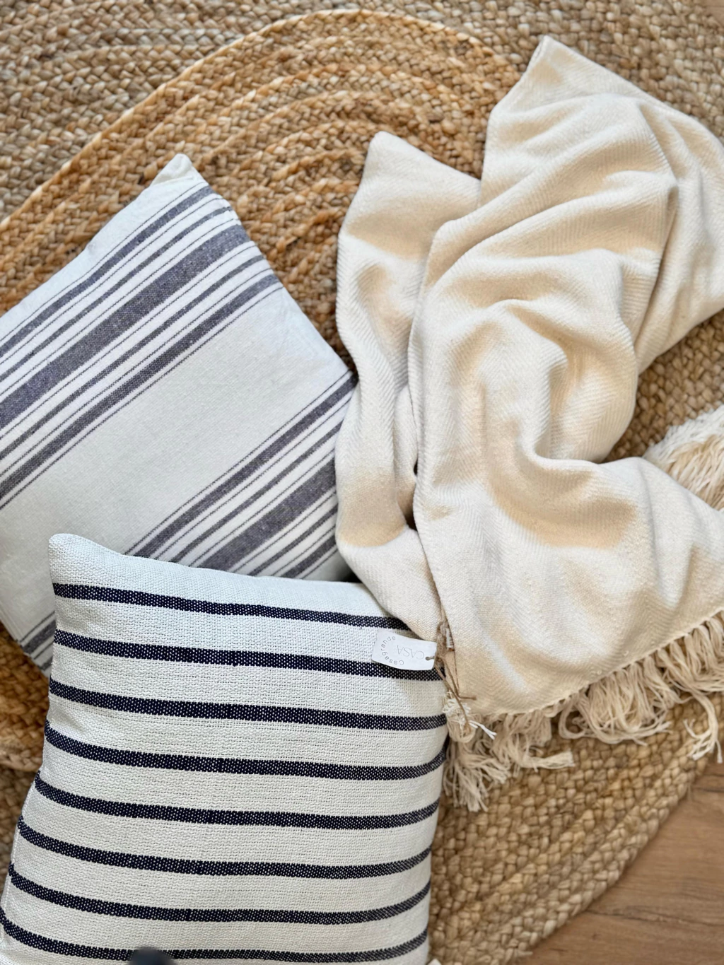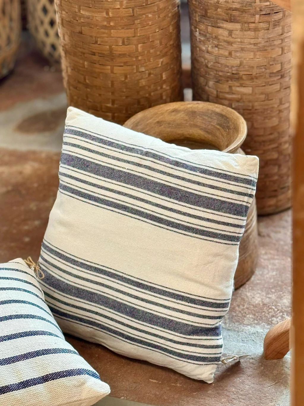 Toda feita em tecido natural cru, com listras em tom de azul. Para compor lindezas!