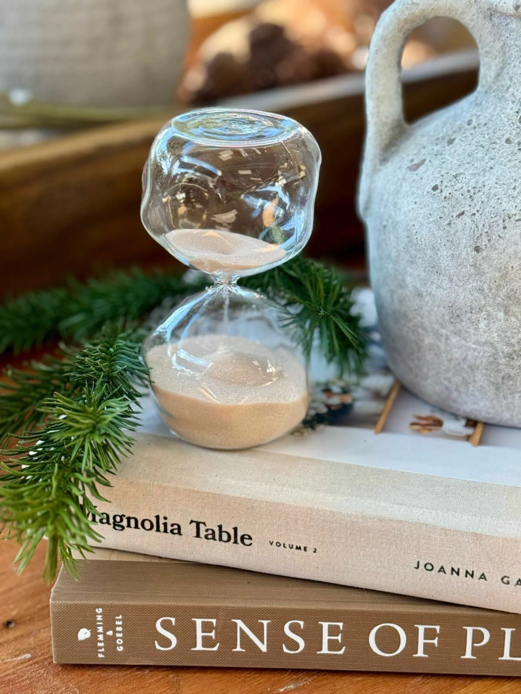Ampulheta em vidro com design mais orgânico e areia em cor bege. Simplesmente linda!