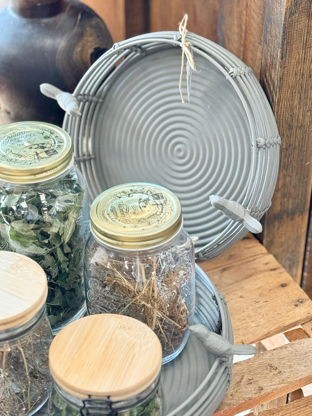Bandeja rendonda em metal, cor cinza com detalhes em fibra natural e passarinhos nas laterais.