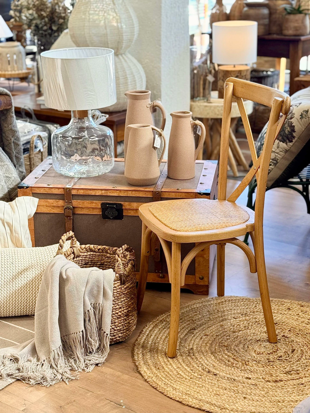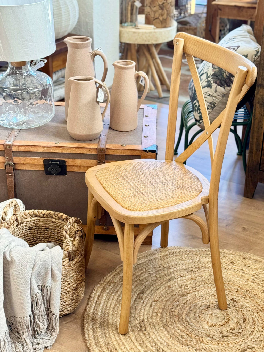 Encosto em madeira trançada e assento em palha natural proporcionam conforto e leveza.