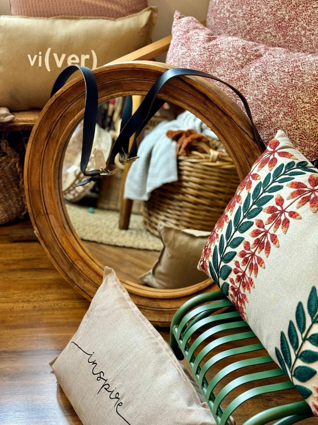 Espelho redondo, detalhe em madeira natural e alça regulável em couro. Lindoo de viver!