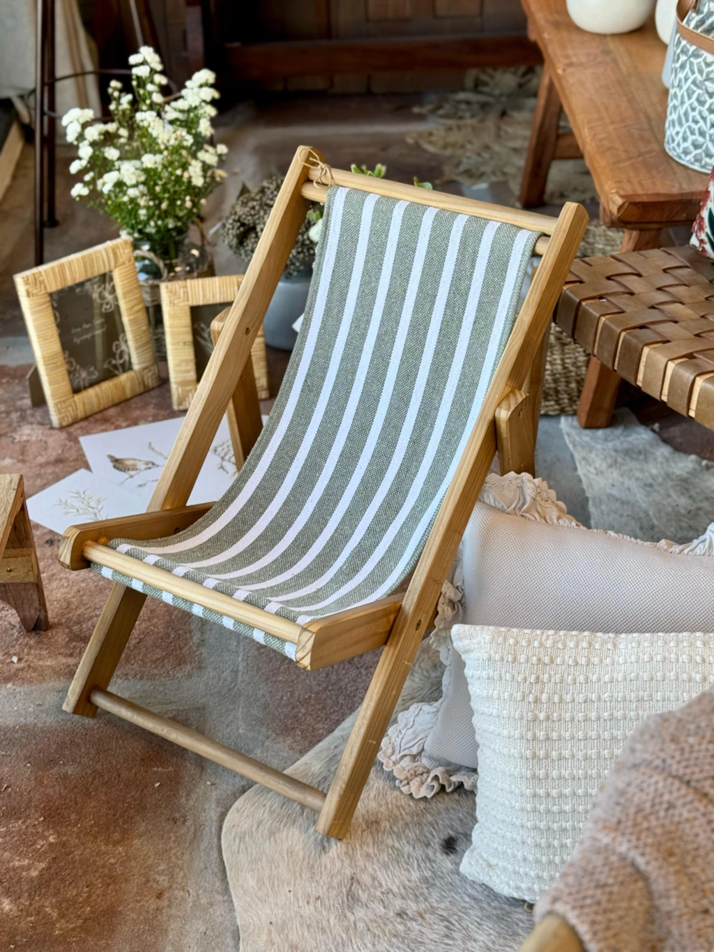 Acabamento todo em madeira maciça e tecido listrado verde e branco.