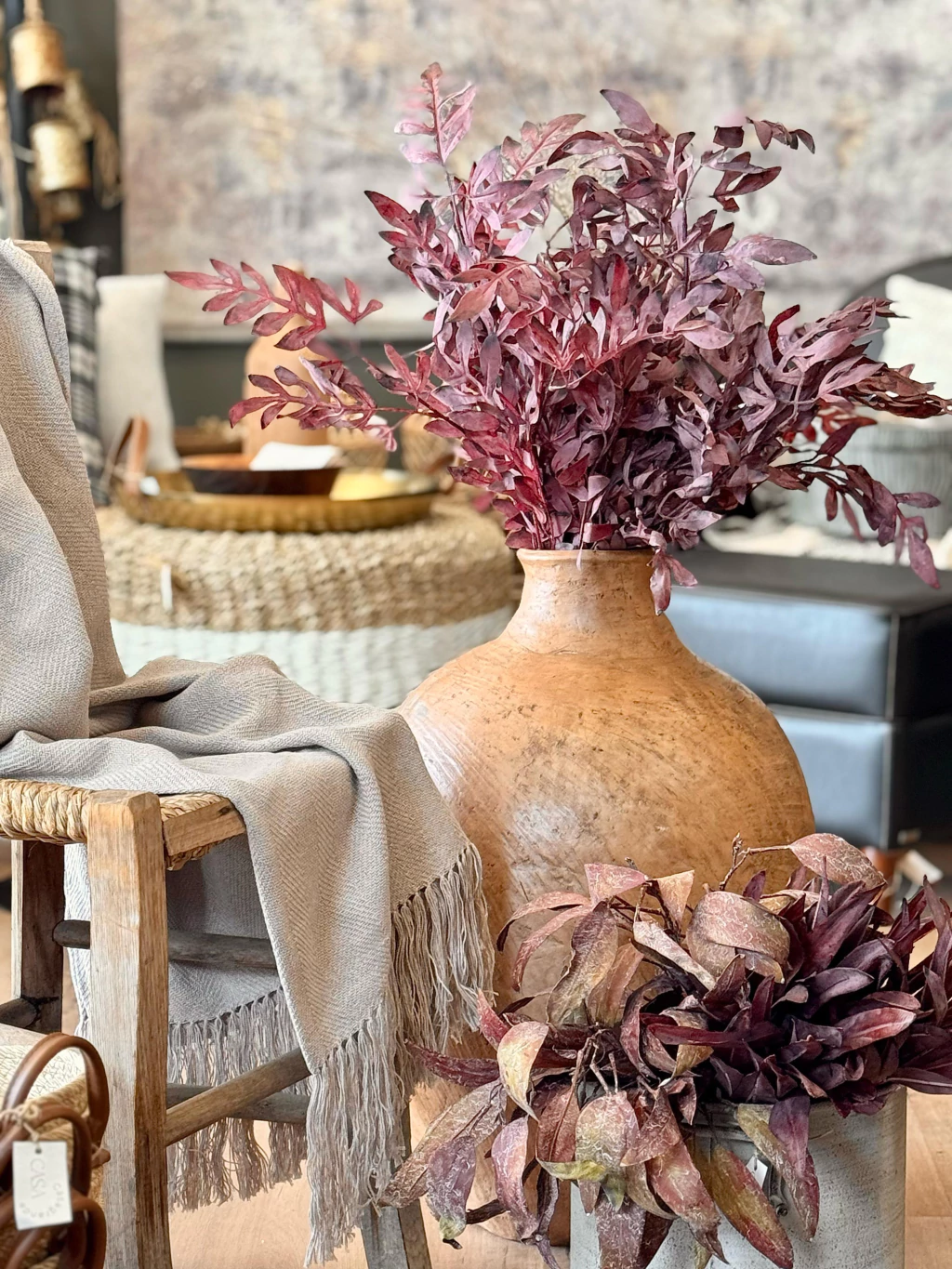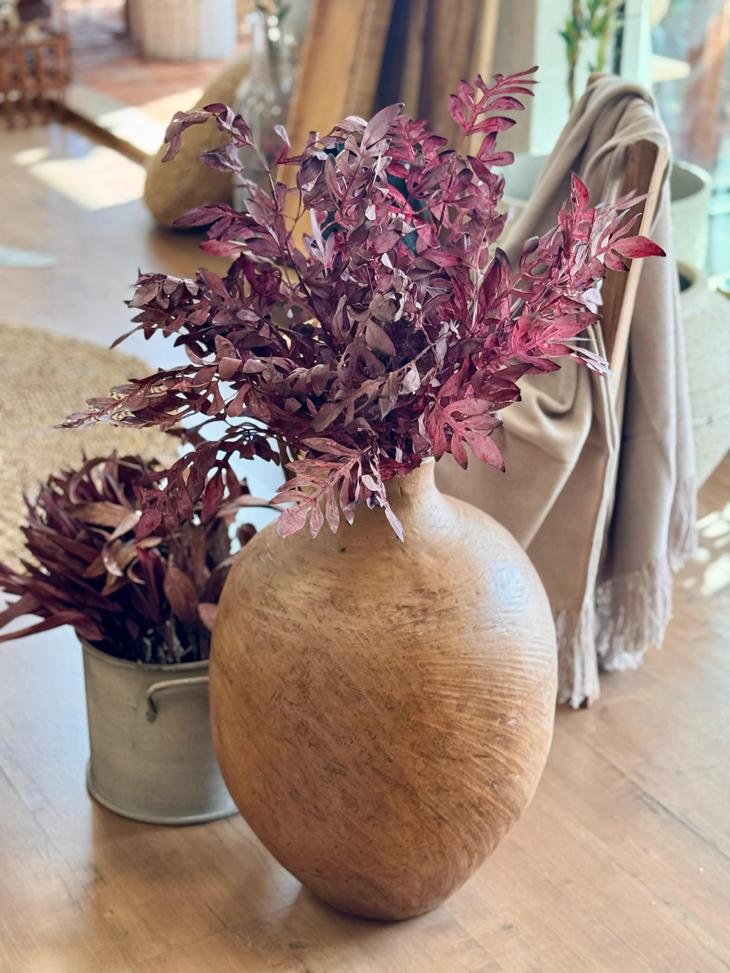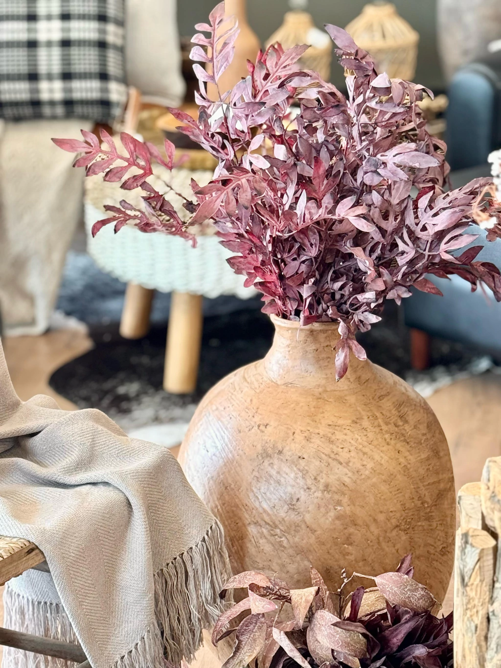 Tamanho: 50cm aprox. na parte das folhas (você pode desmembrar e usar como galhos menores também) e 90cm altura total já incluindo o galho inteiro. A cor das folhas puxa para um marsala mais desgastado, para trazer a sensação de galhos secos.