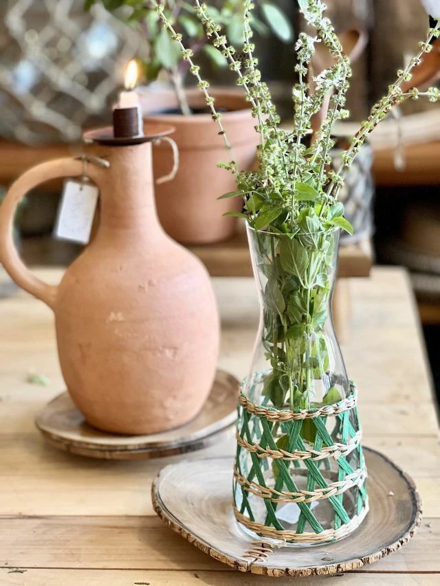 Corpo todo em vidro com capa em material natural, com detalhes em verde. Das misturas lindas que super aconchegam!