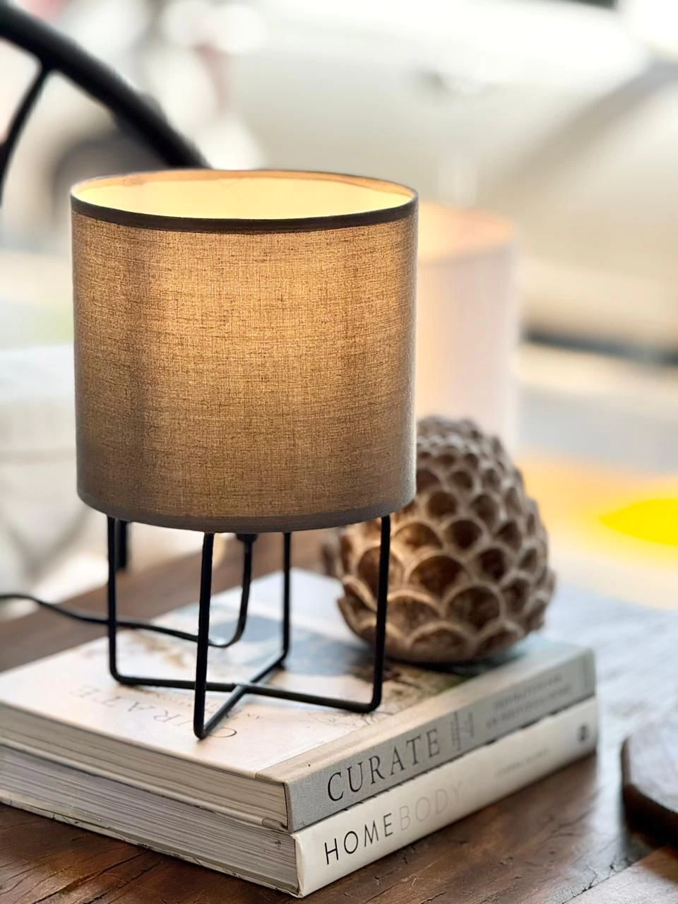 Luminária de mesa com base em metal preto, e cúpula em tecido cinza.