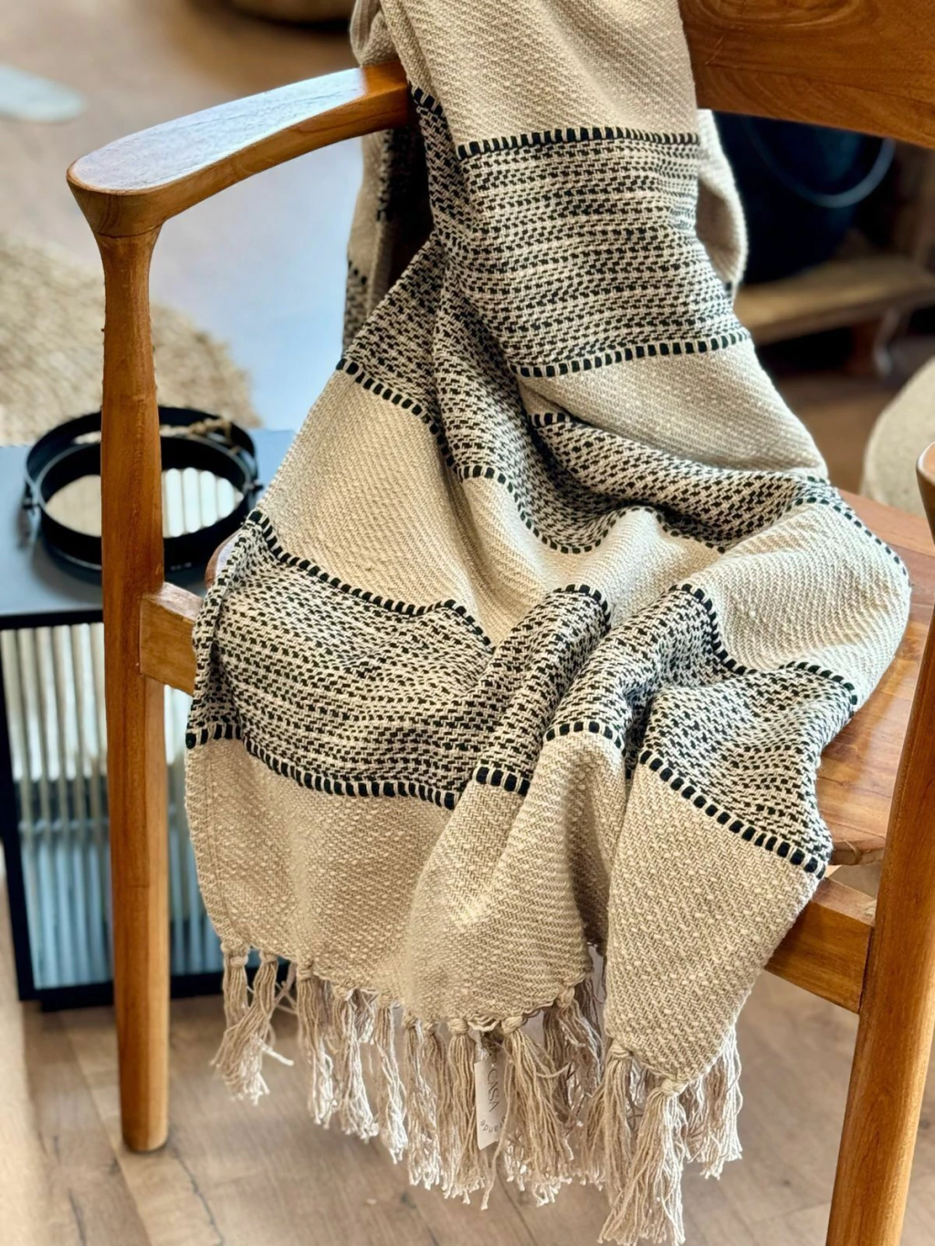 Esse modelo é lindo! acabamento com uma trama super fechada, em tons de bege e preto, com franjas nas pontas. Super bem feita e encorpada! Sabe aquela mistura perfeita do aconchego com um toque moderninho?