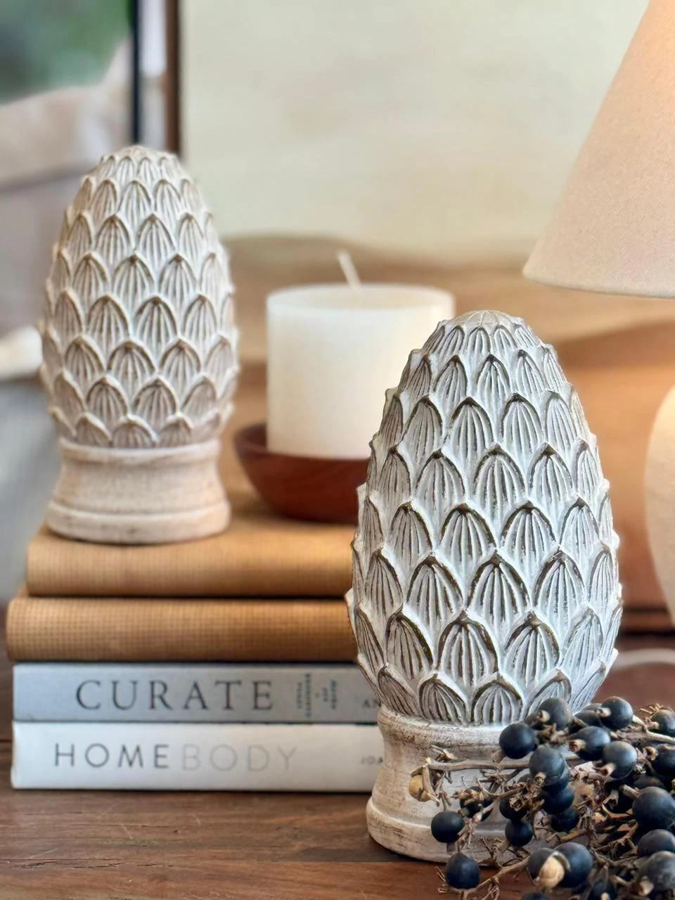 Pinha feita em concreto, com um tom off e detalhes desgastados que a deixam ainda mais bonita! Amei!!