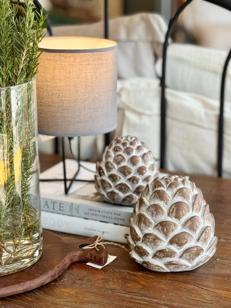 Pinha feita em concreto com fundo claro e detalhe desgastado que a deixam ainda mais bonita! Amei!!