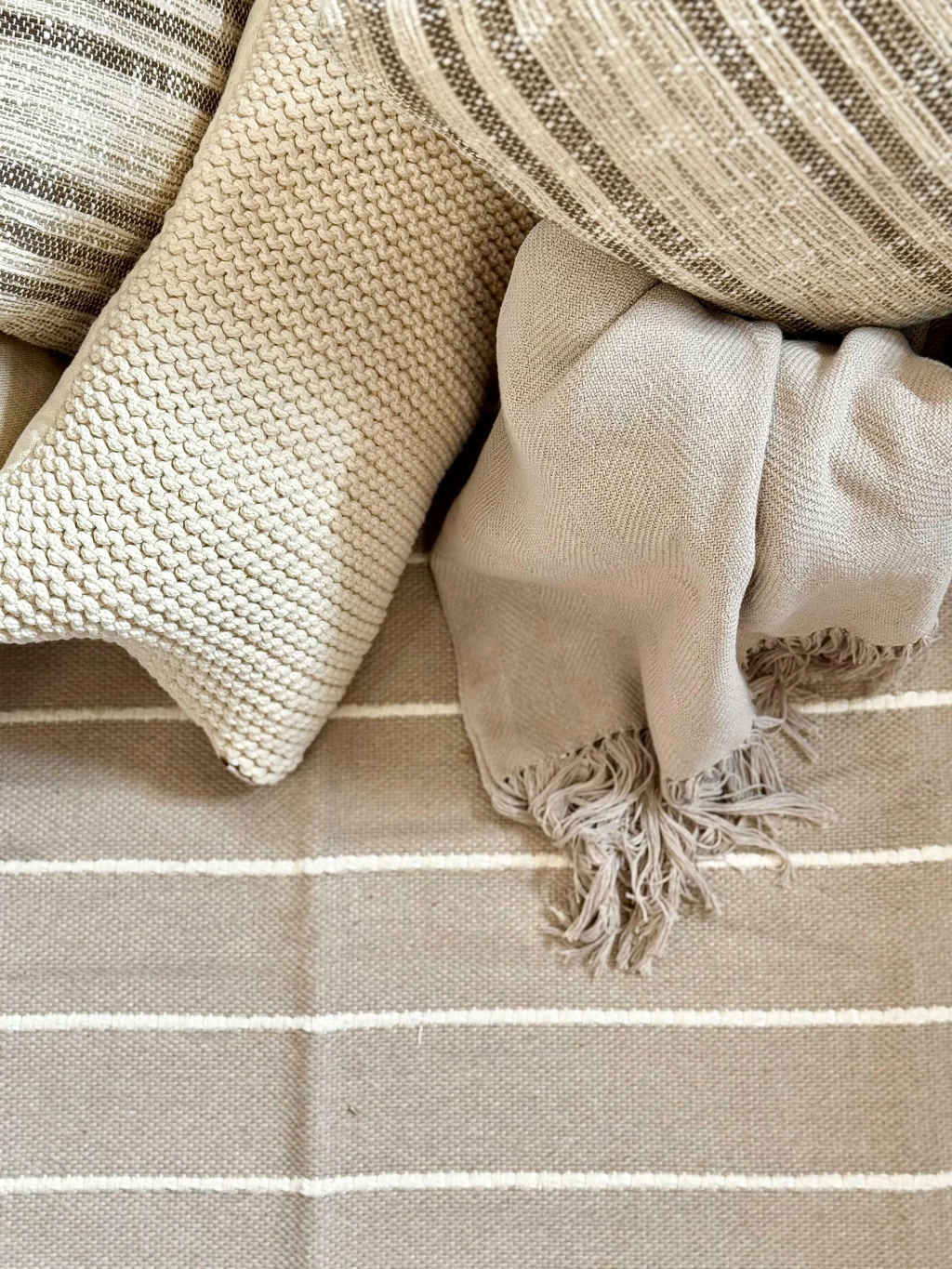 Em tons neutros de um bege acinzentado lindo e listras em branco.
