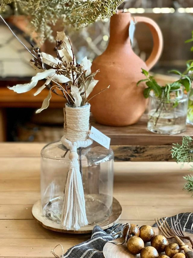 Valor equivalente a um vaso de viro com bocal e tassel em barbante off, não inclui a base ou detalhes da decor, usados como complemento.