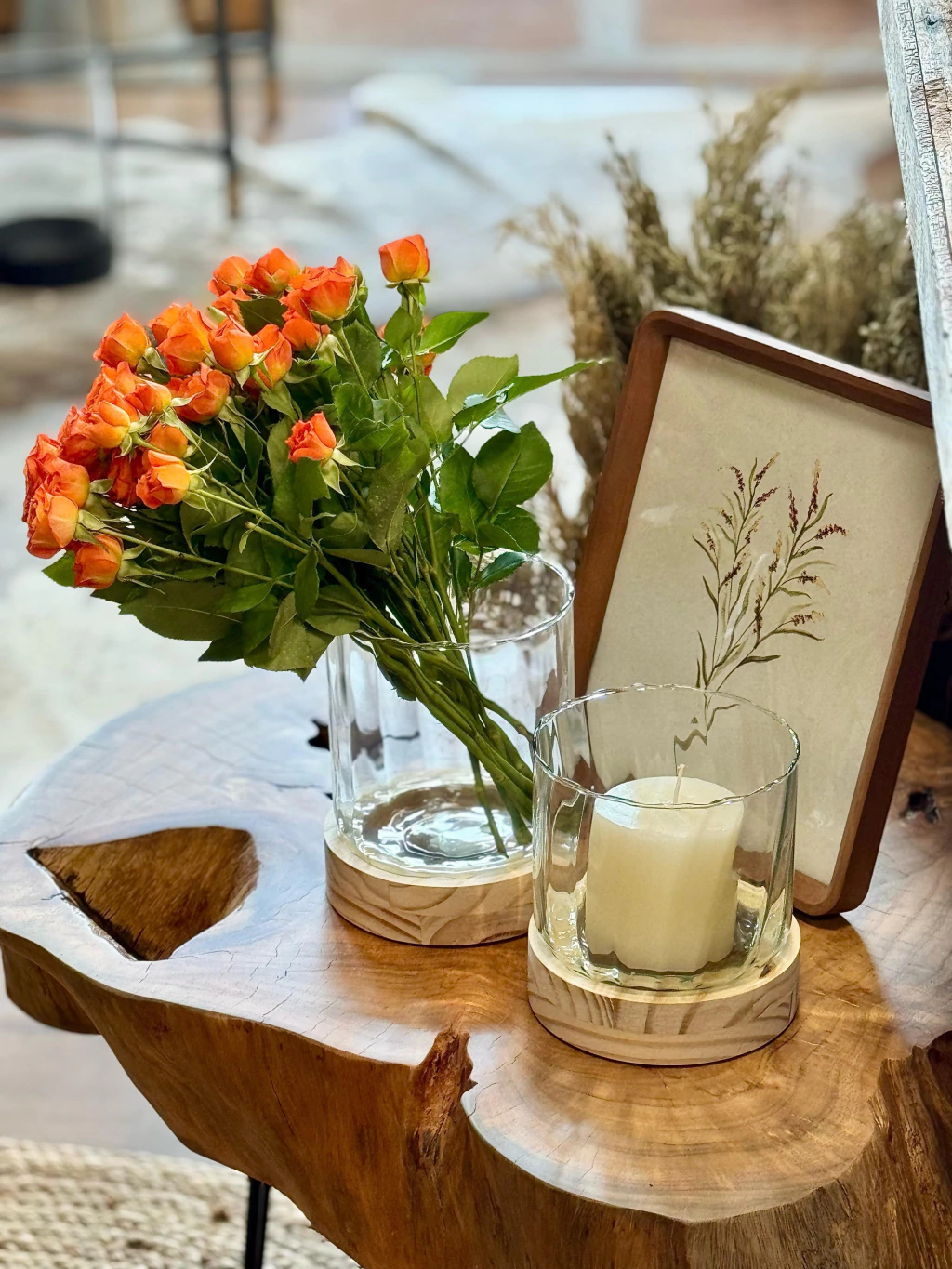 Vaso redondo, base amadeirada mais clarinha, vidro na parte de cima.